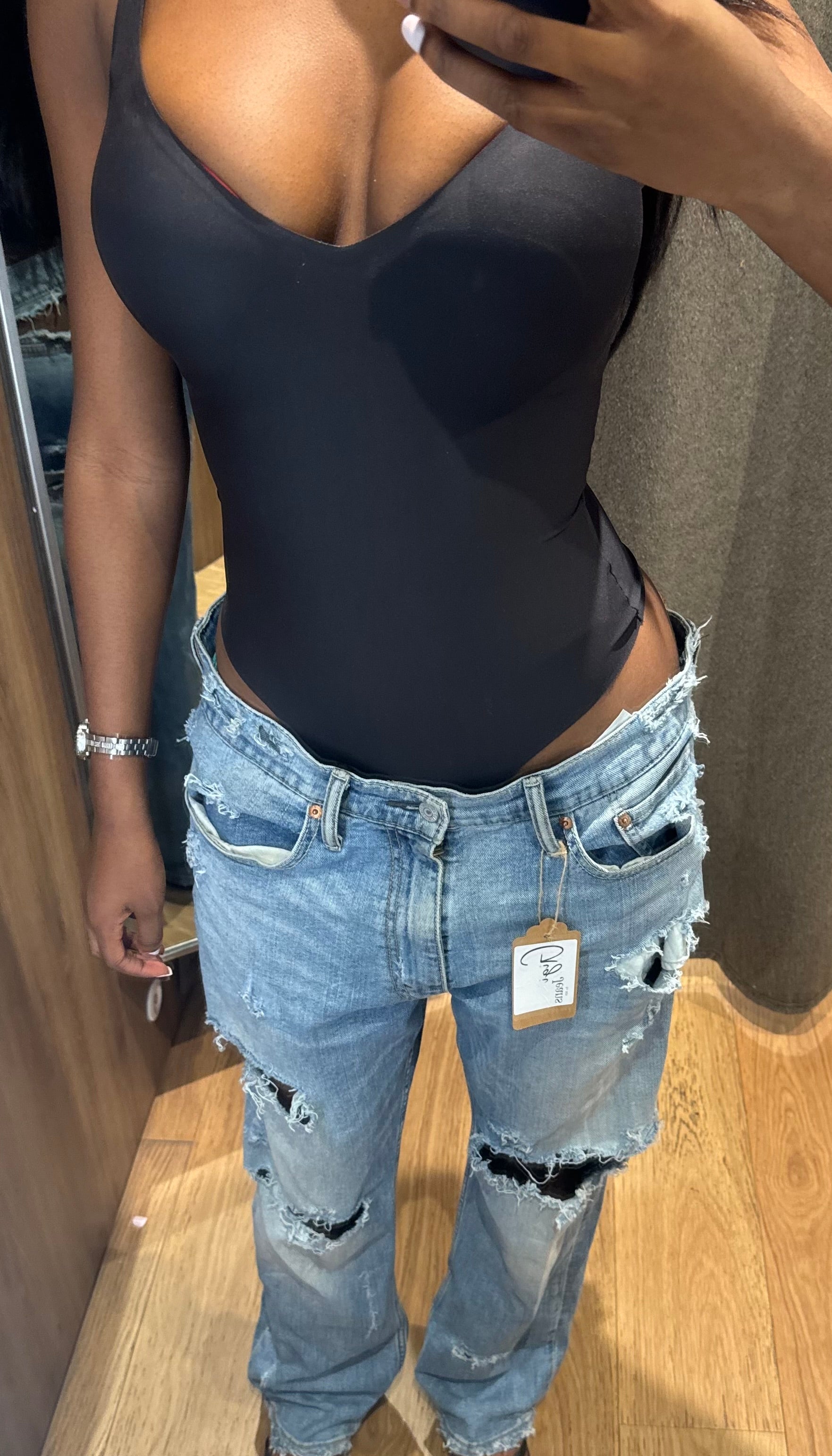 Low Rise , straight-leg fit with intentional distressing and custom staple gradient back pockets,using a relaxed shape through the leg.